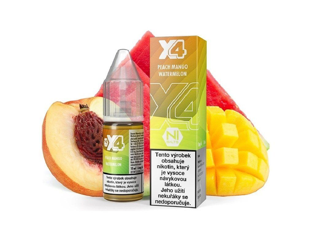 Liquid X4 Bar Juice - Broskev, mango a meloun (Peach Mango Watermelon) 10ml - 20mg e-liquid s nikotinovou solí, mix broskve, manga a melounu, pro POD systémy